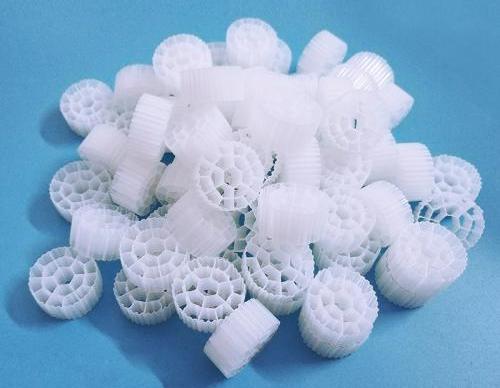 在無機(jī)物原材料共混的基本上,在PE中添加具備親水多功能性官能團(tuán)異構(gòu)化學(xué)物質(zhì),使流化床填料的吸水性提升,掛膜更快,提升微生物菌種的粘附工作能力。另外使流化床填料的相對(duì)密度更貼近于水,掛膜前0.96-0.98g/cm3,掛膜后的相對(duì)密度做到1.0g/cm3上下,使其在管式反應(yīng)器便于與流水混和流動(dòng)性。