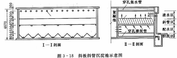 斜管斜板式沉淀池的結(jié)構(gòu)與一般沉淀池相同,是由進(jìn)口、沉淀區(qū)、出口與集泥區(qū)四個部分組成,只是在沉淀區(qū)設(shè)置有許多斜管或斜板。圖3-16為斜管式沉淀池的典型結(jié)構(gòu)。