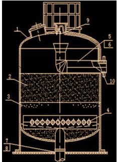 1-罐體;2-濾料層;3-墊料層;4-集配水管;5-進(jìn)水管;6-反沖洗排水管;7-出水管;8-反沖洗進(jìn)水管;9-自動排氣閥;10-排氣管