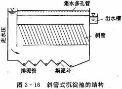 斜管斜板式沉淀池的結(jié)構(gòu)與一般沉淀池相同,是由進(jìn)口、沉淀區(qū)、出口與集泥區(qū)四個部分組成,只是在沉淀區(qū)設(shè)置有許多斜管或斜板。圖3-16為斜管式沉淀池的典型結(jié)構(gòu)。