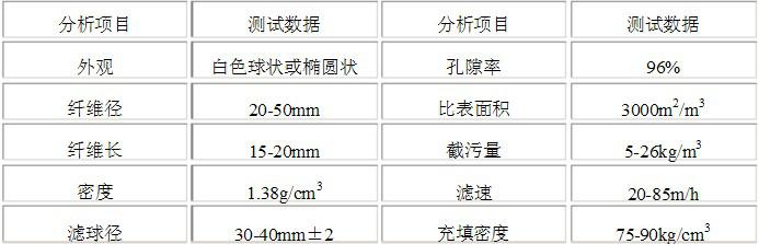 96%,充填密度50kg/cm3,比表面積3000m2/m3。改性纖維球絲徑細(xì),比表面積大,比表面積高達(dá)2000m/g。由于纖維絲徑細(xì)的特點(diǎn),它疊加后濾層孔隙小,而疊加后濾層孔隙度在80%以上,對(duì)懸浮物的攔截作用比其他濾料都優(yōu)良,因此對(duì)低滲透油藏的注入水處理尤為理想;對(duì)高懸浮物水的排放和回用有要求的過濾更加適用。